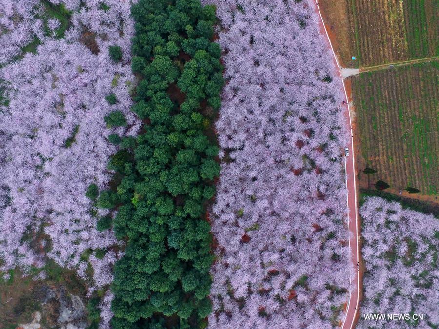 Aerial photo taken on March 28, 2017 shows cheery blossoms at the Pingba Farm in the Gui'an New District of Anshun City, southwest China's Guizhou Province. (Xinhua/Qin Gang)