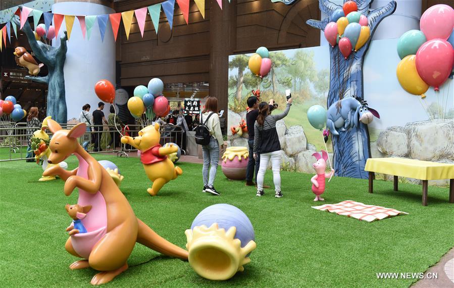 Tourists take photos during a Winnie the Pooh exhibition in Hong Kong, south China, March 29, 2017. (Xinhua/Qin Qing)