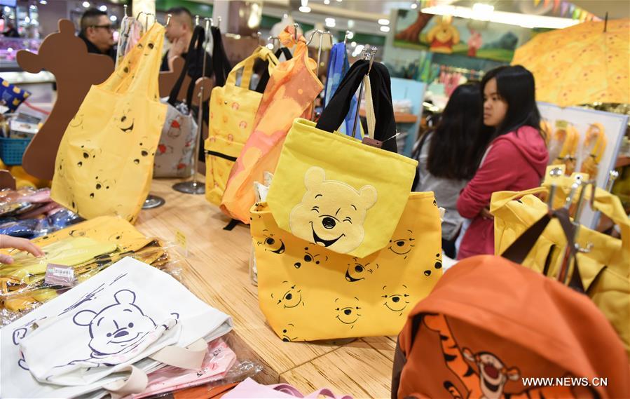 Tourists shop at a themed store during a Winnie the Pooh exhibition in Hong Kong, south China, March 29, 2017. (Xinhua/Qin Qing)