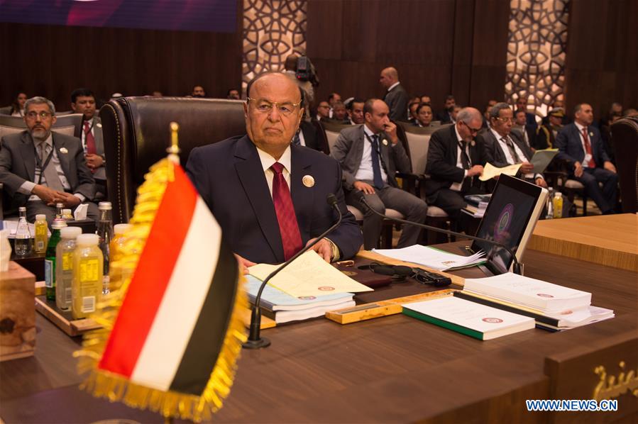 Yemeni President Abd-Rabbu Mansour Hadi (front) attends the 28th Arab League Summit at the Dead Sea, south of the capital Amman, Jordan, on March 29, 2017. The 28th ordinary Arab League Summit opened in Dead Sea, Jordan on Wednesday morning, with 15 state leaders from the 22 member states attending the meeting. (Xinhua/Meng Tao)