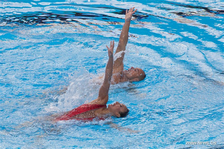 Bill May(top)/Kanako Kitao Spendlove of the United States of America compete during the Mixed Duet Technical preliminary of Synchronized Swimming at the 17th FINA Aquatics World Championships held in Budapest, Hungary on July 15, 2017.(Xinhua/Attila Volgyi)