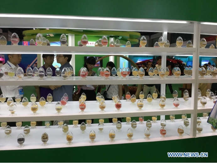 Seeds of hybrid crops are on display during an exhibition on China's science and technology achievements during the 12th Five-Year Plan period (2011-2015) in Beijing, capital of China, June 4, 2016. (Photo source: Xinuanet/Zhang Dongmiao)