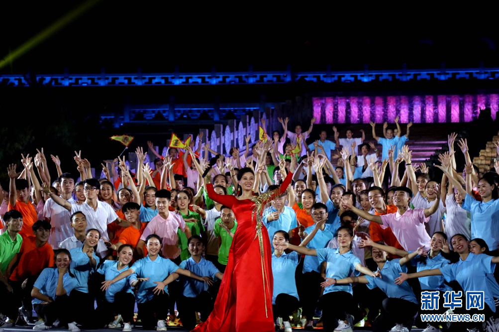 Performers pose for a group photo during the Hua Gate light show in Linfen, north China's Shanxi Province, on Sept. 19, 2018. (Xinhuanet Photo)