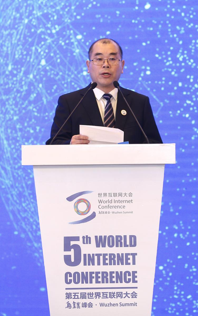 Zhu Guoxian, member of the Standing Committee and head of the publicity department of Zhejiang provincial CPC committee, delivers a speech at a ministerial forum themed "Bridging the Digital Divide" in Wuzhen, East China's Zhejiang province on Nov 8, which serves as a sub-forum of the fifth World Internet Conference. (Photo by Zou Hong/chinadaily.com.cn)
