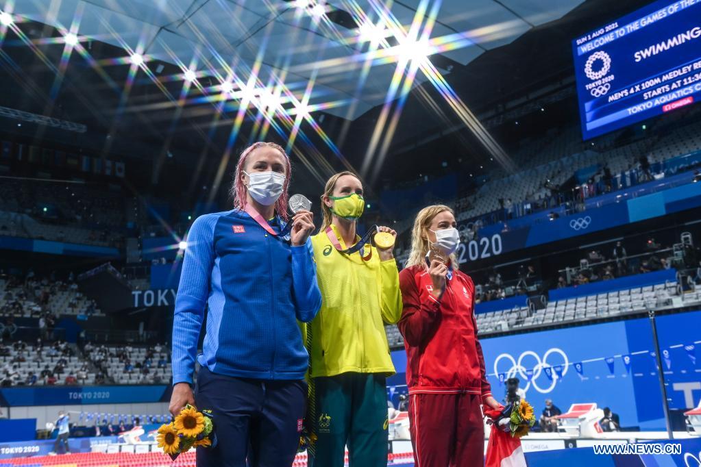 Gold medalist (C) Emma Mckeon of Australia, silver medalist Sarah Sjoestroem (L) of Sweden and bronze medalist Pernille Blume of Denmark pose after the women's 50m freestyle final of swimming at the Tokyo 2020 Olympic Games in Tokyo, Japan, Aug. 1, 2021. (Xinhua/Xia Yifang)