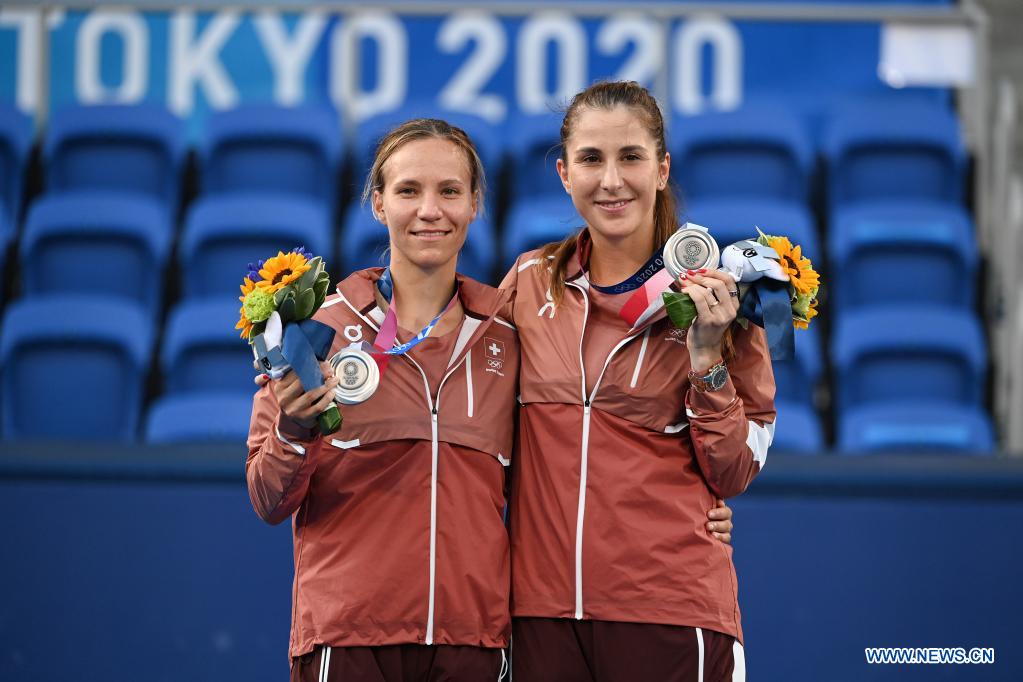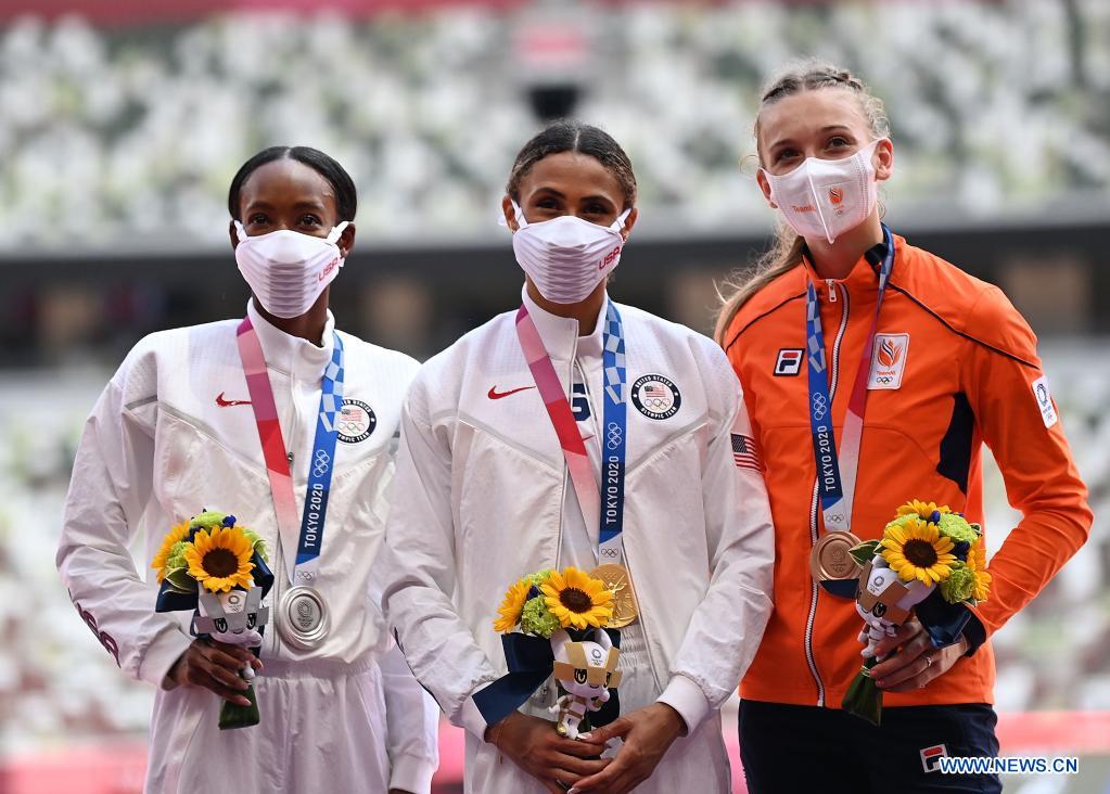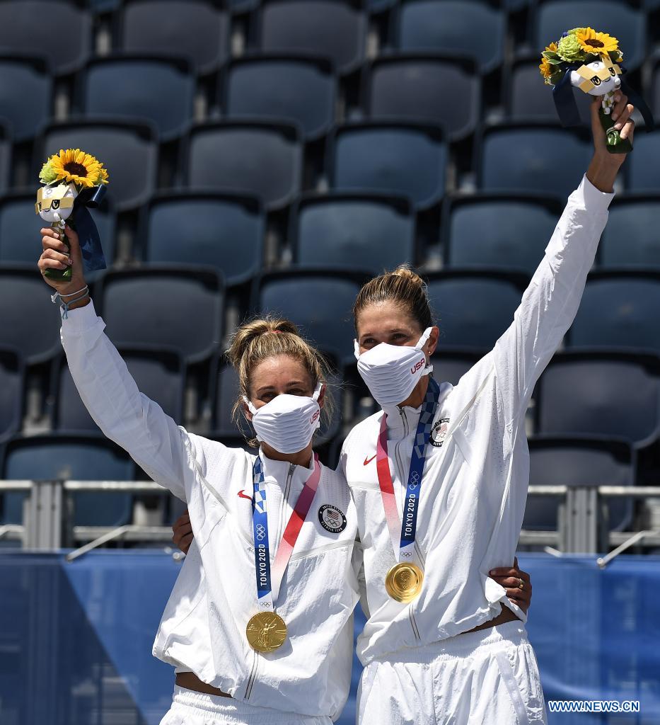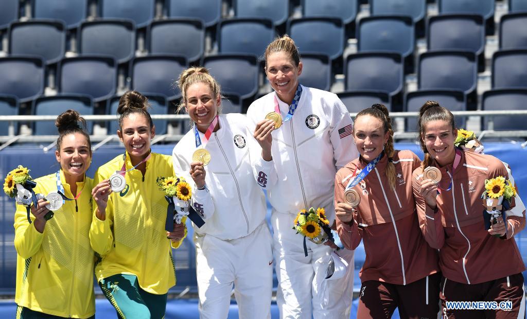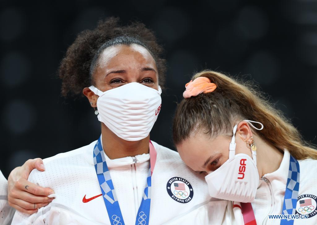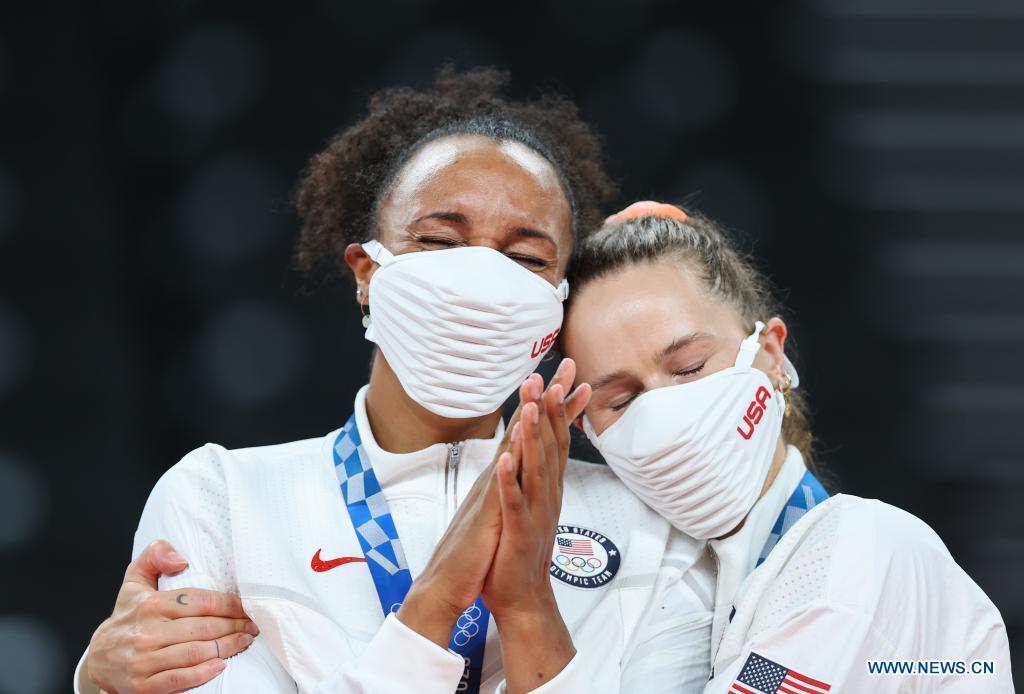 Haleigh Washington (L) of Team USA reacts on the podium during the awarding ceremony of the women's volleyball at Tokyo 2020 Olympic Games, in Tokyo, Japan, Aug. 8, 2021. (Xinhua/Ding Ting)