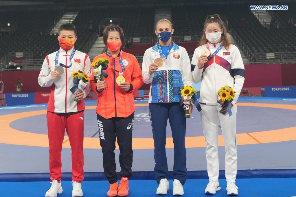 Gong Lijiao of China reacts during the awarding ceremony of the Women's Shot Put at the Tokyo 2020 Olympic Games in Tokyo, Japan, Aug. 1, 2021. (Xinhua/Ju Huanzong)