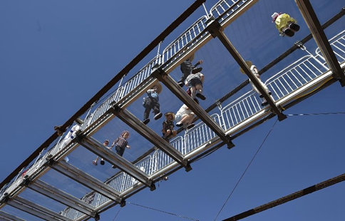 Tourists walk on glass bridge across Yellow River in Ningxia
