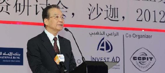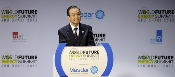 Chinese Premier Wen Jiabao addresses the opening ceremony of the fifth World Future Energy Summit in Abu Dhabi, the United Arab Emirates, Jan. 16, 2012.