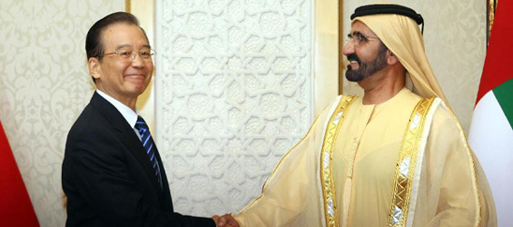 Premier Wen shakes hand with Sheikh Mohammed bin Rashid Al Maktoum, Vice President and Prime Minister and Ruler of Dubai of the United Arab Emirates.