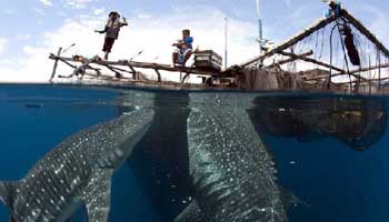 Whale sharks enjoy "buffet" from fishing net's leaks