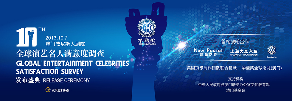 华鼎荣誉,是天下英才传媒在中国人权发展基金会支持下,创办的集演艺名人公众形象、电视剧、电影于一身的观众满意度调查平台。这项调查自从2007年6月开始已经成功举办了多届。虽然创立时间不久,由于目前中国与其他国家此前并未设置类似社会责任与公众形象竞赛奖励,华鼎荣誉以其独立的调查方式和公信力,已发展成为一项中国最受瞩目的口碑奖,其奖杯采用的是象征文明、和平、美好的中国青铜器代表“鼎”的造型。时间:2013年10月7日20:00 地点:澳门威尼斯人剧院