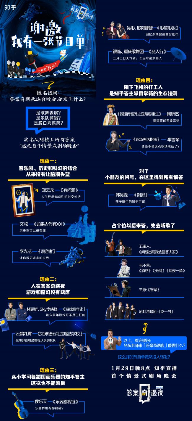 知乎首个情景式剧场晚会“答案奇遇夜”将于1月29日晚8点,在知乎、快手、爱奇艺等平台同步播出。继官宣海报、概念片、嘉宾阵容陆续放出之后,完整节目单也终于在1月26日正式揭晓。