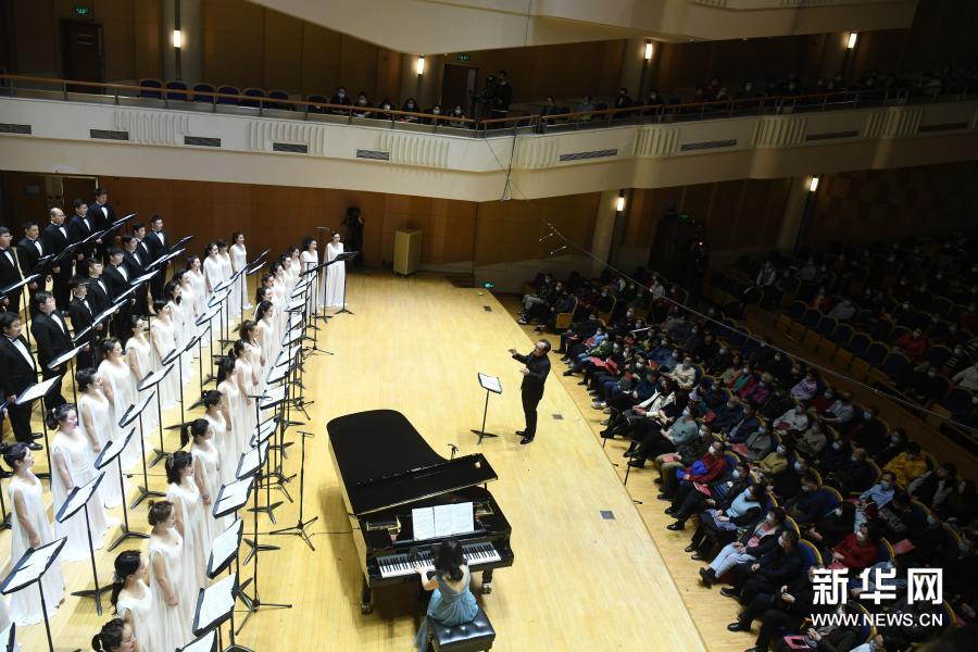 3月14日拍摄的音乐会现场。当日,庆祝中国共产党成立100周年《红色经典》合唱音乐会在北京音乐厅上演。中国交响乐团合唱团演唱了《唱支山歌给党听》等经典歌曲。新华社记者 金良快 摄