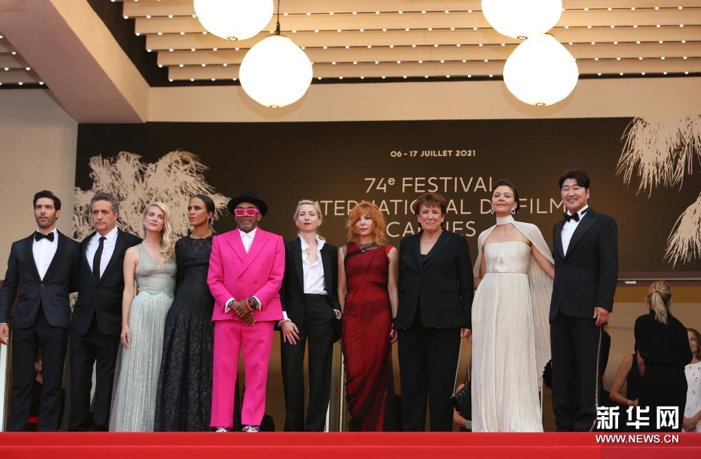 7月6日,第74届法国戛纳国际电影节主竞赛单元评委会主席、美国导演和制片人斯派克·李(左五)携主竞赛单元评委出席开幕式红毯。新华社记者 高静 摄