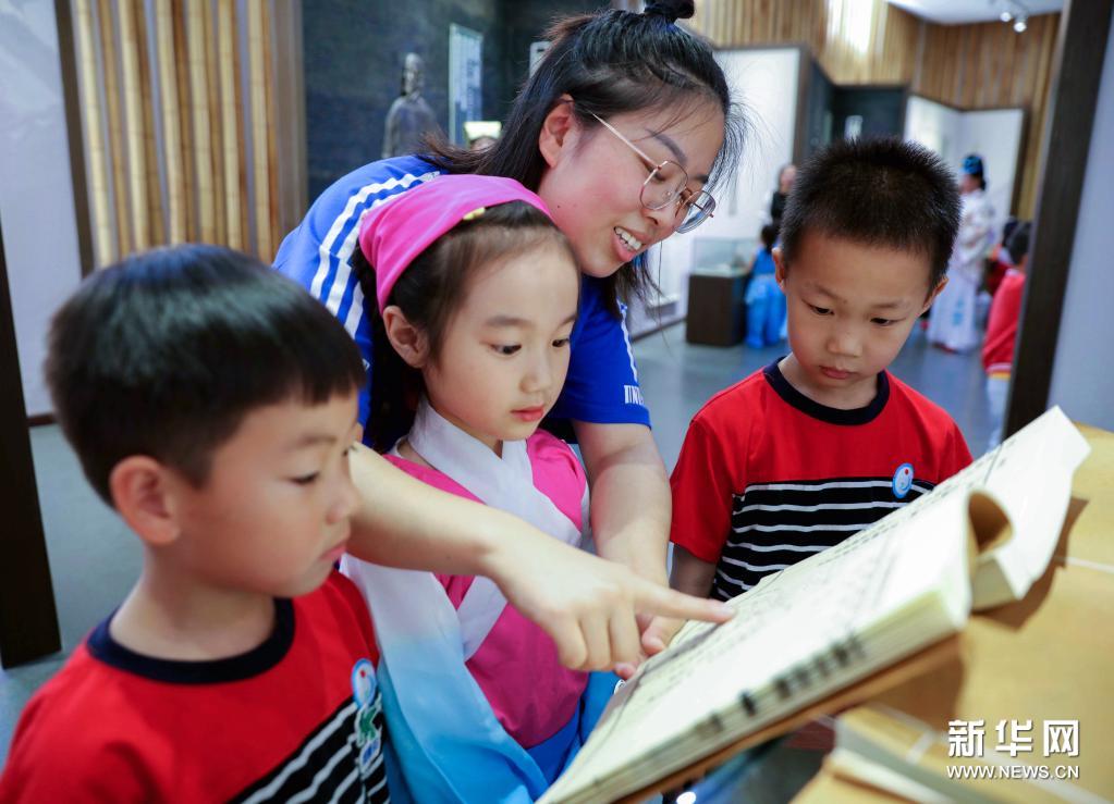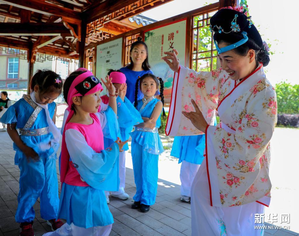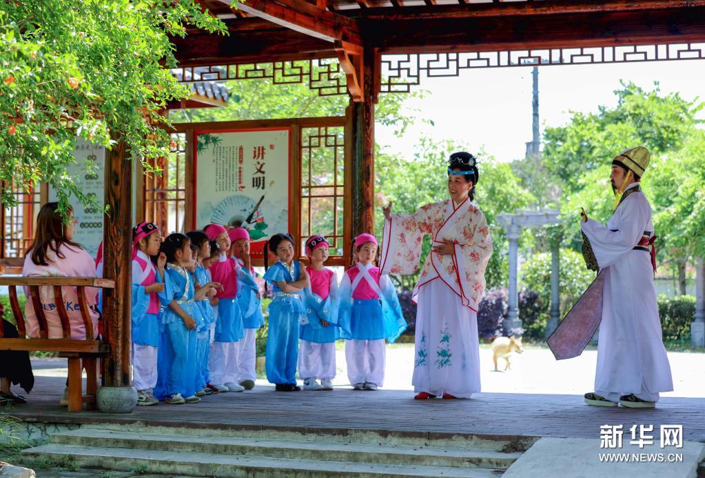 当日,浙江省长兴县夹浦镇中心幼儿园开展“走近元曲 传承非遗文化”活动,通过参观明代戏曲家臧懋循纪念馆、观看戏曲《臧懋循》片段、跟非遗传承人学唱元曲等,让孩子们体验和传承传统戏曲文化、感受非遗文化的魅力。臧懋循是明代戏曲家、戏曲理论家,以编著《元曲选》而闻名。新华社记者 徐昱 摄