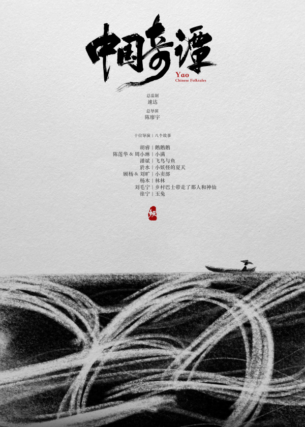 发布会上,作品释出九张概念海报,其中主海报的神秘意境带来无限遐想。一人湖上独钓,而看似风平浪静的水面下却暗潮汹涌,仿佛有什么在潜行游动伺机而上。将海报倒置则豁然开朗,“妖”字赫然于水下,与上方的红色的印章呼应——这是一个关于“妖怪”的故事。海报大面积留白以无胜有,强烈的对比也展现着作品对于“妖怪”的定义:不仅仅是简单的善或者恶,而是人类对未知世界的想象,更是人类精神世界的一面镜子。