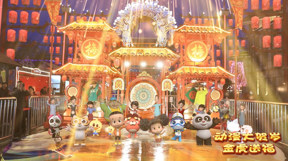 今年的《动漫大贺岁-金虎送福》更是全面升级,大头儿子、棉花糖、熊猫和和等动画明星与鞠萍、小鹿、月亮等多位总台少儿频道知名主持人真实互动,通过动漫大贺岁虎年生肖吉祥物福小虎的“寻找花纹之旅”,串联起了多个异彩纷呈的实拍场景与精良节目。