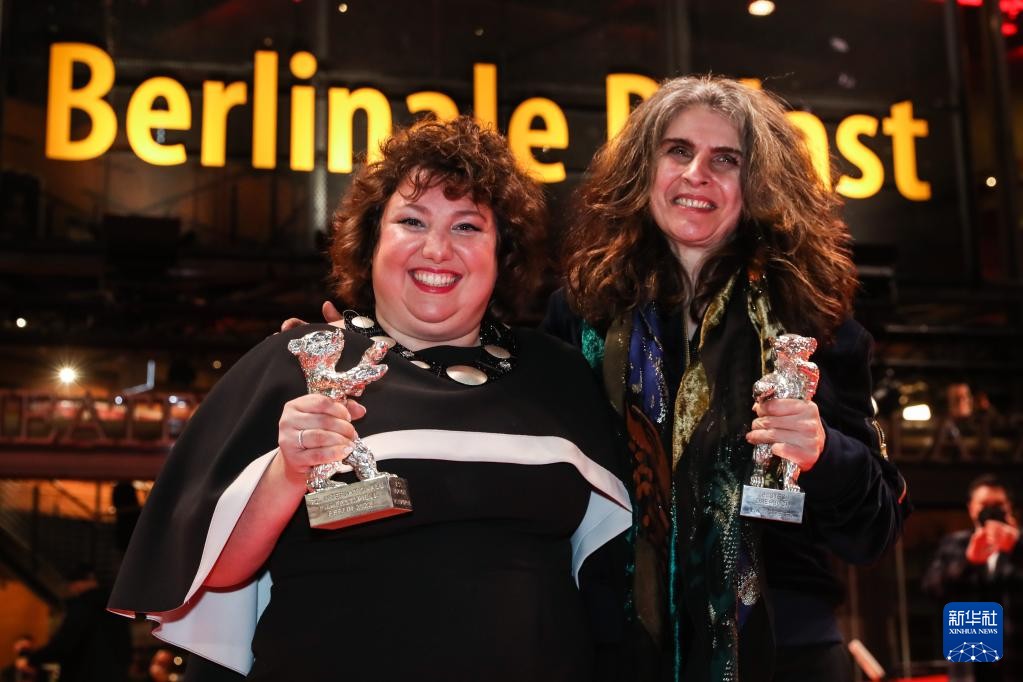 2月16日,在德国柏林,演员梅尔泰姆·卡普坦(左)与编剧莱拉·斯蒂勒在颁奖仪式后亮相红毯。她们凭借影片《库尔纳兹诉小布什》分别获得最佳主角银熊奖和最佳编剧银熊奖。新华社记者 单宇琦 摄