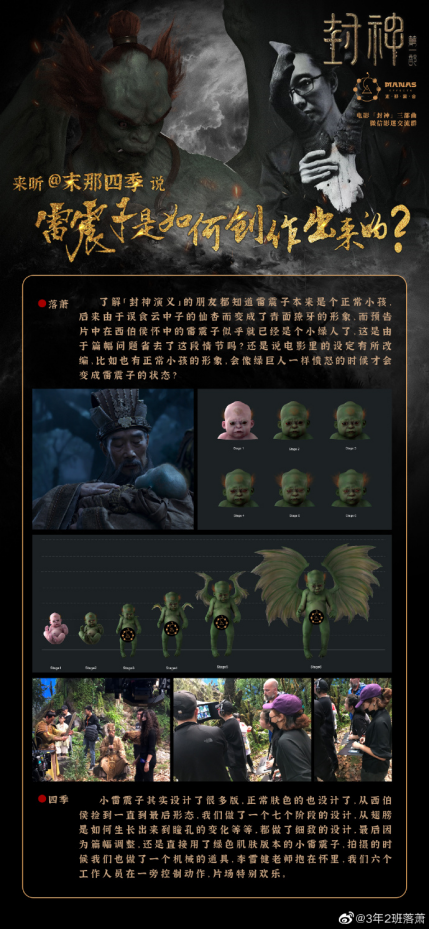 在满足了【传统性】与【合理性】之后,我们还面临着【统一性】的难题:一是时间线上为了满足篇幅舍弃部分造型的统一性:比如原著中雷震子是长大后误食了仙杏才变成了青面獠牙的形象,其实从西伯侯捡到他到最后形态我们做了七个阶段的设计;其中包括正常肤色的小雷震子到翅膀生长瞳孔变化的各阶段细致造型,但最后因为篇幅调整我们需要舍弃一些故事铺垫的过程,最终还是选择了绿色皮肤的小雷震子——不得不提拍摄的时候为他做了个机械的道具给李雪健老师抱着,六个工作人员围绕着控制动作,看起来甚至有种花团锦簇的喜庆。