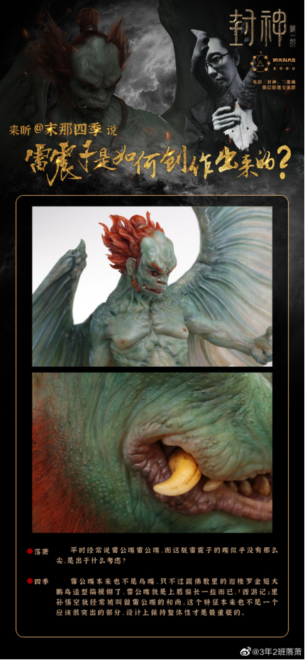 原著中形容他“两边肉翅身长二丈,面如青靛发似朱砂,眼睛暴湛獠牙恒生,出于唇外长嘴雷公”——这里便可以看出与往常印象和历代作品中的细微差别了,“雷公嘴”是指上唇结构偏长,毕竟我们熟悉的悟空也经常被叫做“毛脸雷公嘴的和尚”,而在传统作品中容易与迦楼罗金翅大鹏鸟的造型模糊混淆留下一个雷震子“鸟嘴”的印象;“肉翅”也是基于原著的初始皮肤,在设计上围绕电影造型的设定需求来进行一些更个性化的调整——毕竟每一个时代都会有一个具有当代特征的形象,封神里诸多人物其实也都是在不同时期不同文化背景下演变成现在的模样。