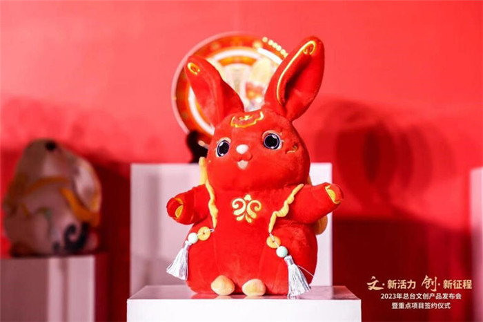 发布会上,“瑞兔春碗”、“新春喜兔盘”、“团团迎春”2023春节福礼、春晚生肖手绳、春晚年品礼盒、兔团团毛绒玩偶、兔团团铜质、PVC摆件等“2023年总台文创春节重点产品”次第登场,令人目不暇接。