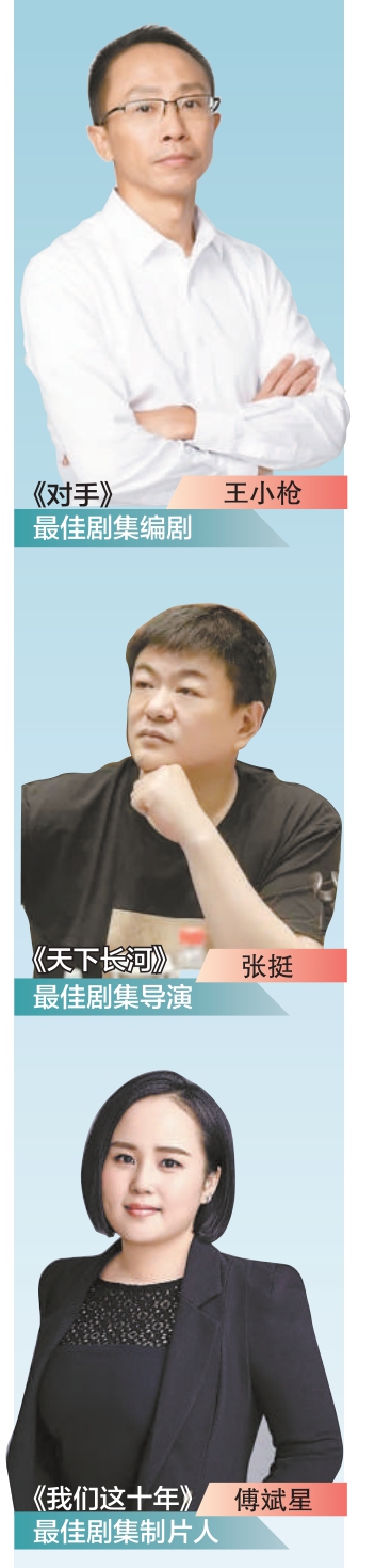 主创方面,2022年大导演、大编剧和大投资的作品不胜枚举。最终,最佳剧集编剧由《对手》编剧王小枪获得,最佳剧集导演由《天下长河》导演张挺获得,最佳剧集制片人则花落《我们这十年》总制片人傅斌星。