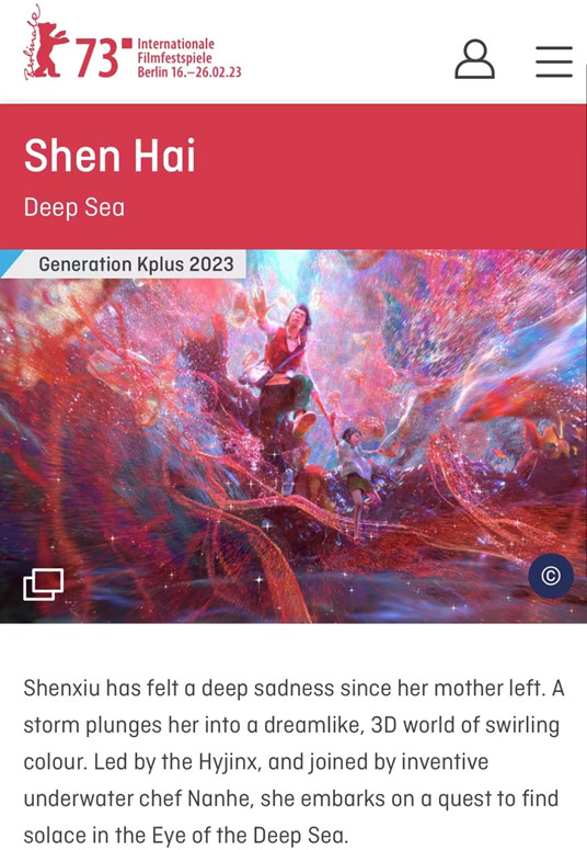 将于大年初一上映的动画片《深海》入围柏林电影节新生代单元,组委会评论道:“田晓鹏导演的新片《深海》,以其前所未见的视觉和极具野心的叙事,让我们感到震撼。”