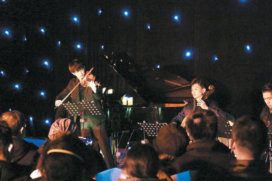 (2月14日晚,观众在798艺术区内的一家展馆欣赏古典音乐)