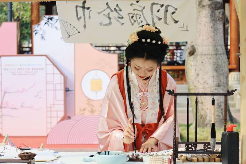 此外,活动现场还设置了“香囊制作”“传统灯笼制作”“扇面书法”等非遗文化体验摊位,深受粤港澳三地青年喜爱。来自侨乡多家企事业单位的80余名优秀青年“甜蜜互动”,在饱食“中华传统文化大餐”的同时,还通过参与沉浸式汉服体验、非遗手作体验、岭南建筑文化研学等环节,加深彼此的了解。