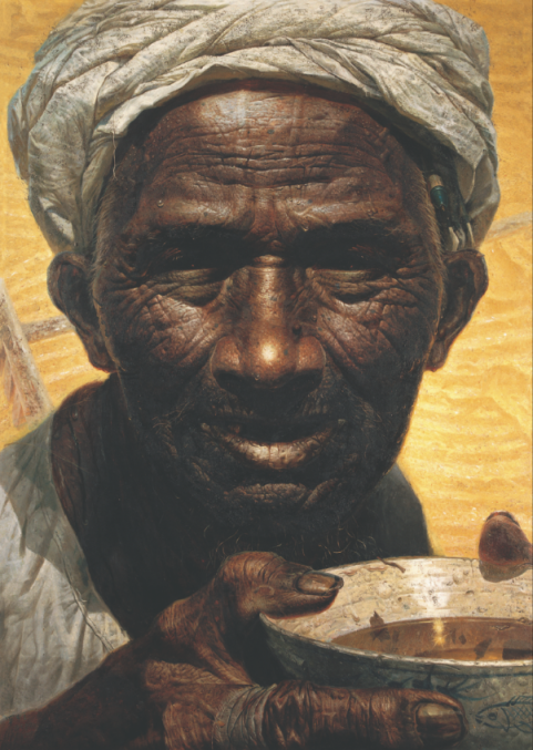 烈日下的一位老农,在劳动的间隙手捧粗瓷碗准备喝水,大颗晶莹的汗水流过他脸上深深的沟壑。展览展出的罗中立油画《父亲》以纪念碑式的宏伟构图、超写实的手法,饱含深情地刻画出中国农民的典型形象。1980年,罗中立以《父亲》震撼中国画坛,并获第二届全国青年美展一等奖。数十年来,这张脸庞深深打动了无数中国人的心,成为改革开放以来中国现实主义艺术创作的一道丰碑。
