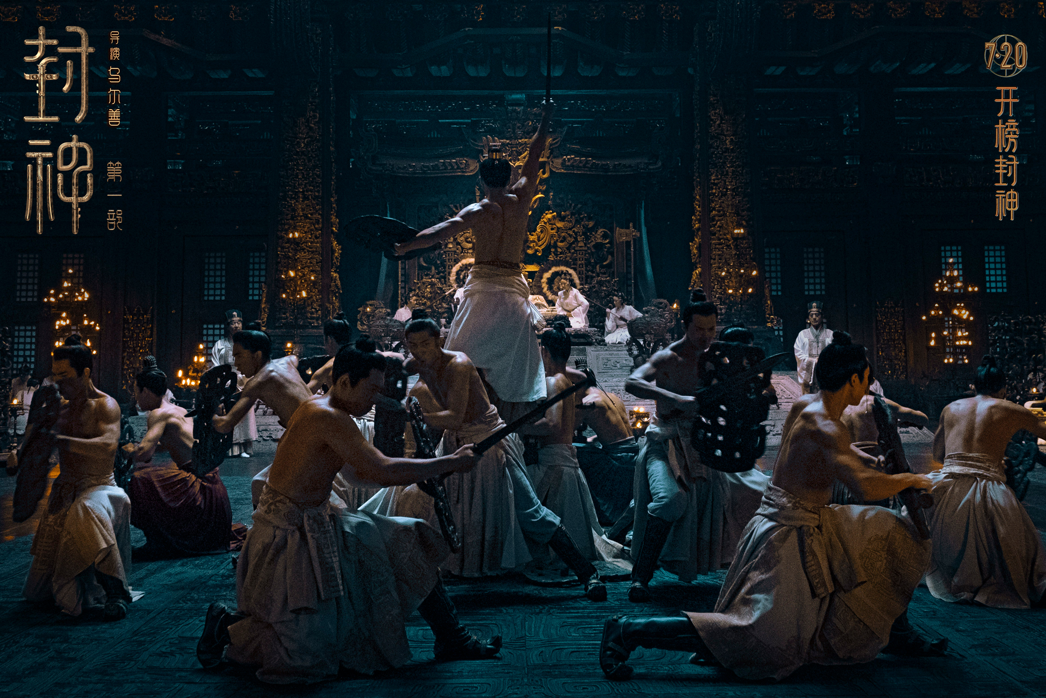 “庆功宴·质子战舞”是质子旅年轻演员第一次集体完成的一场戏,质子战舞排练指导吴芳美在特辑中阐述了这场战舞的编排理念:“出门打仗的那种仪式感,在编排上属于阵列感比较多的形式变化,体现质子们英勇帅气彪悍的那一面,跟他们情绪高昂的爆发力。”因此,这场戏的音乐选择了从视觉上还原、声音上想象编镈、筑等声音穿透力强的古代乐器的演奏,剧组用古筝代替筑的音色,蒙柯卓兰透露:“为了体现它的力量感,所以我们基本上弦乐器全部用扫弦的方式。”音乐创作上的创新和匠心,营造出一个封神世界的听觉体系,让导演乌尔善感慨:“在电影里能够呈现出我们对中国古典世界的音乐想象,我觉得是一个挺大的突破。”相信电影《封神第一部》的音乐,也将让观众从听觉上领略到三千年前的神话史诗世界。