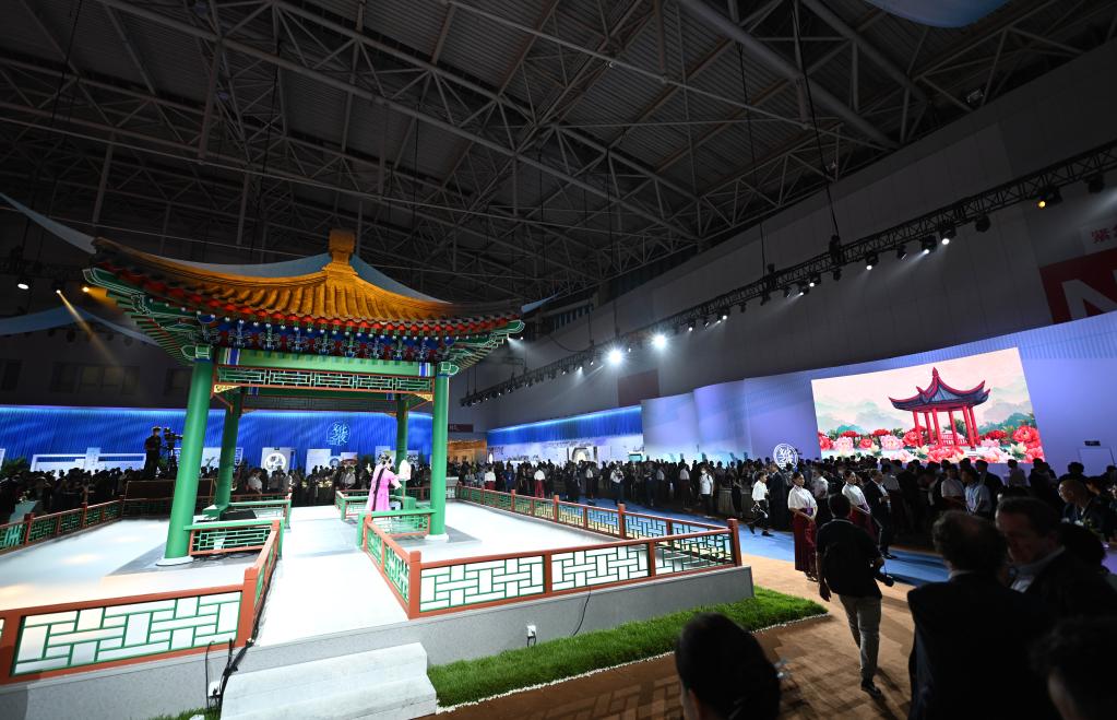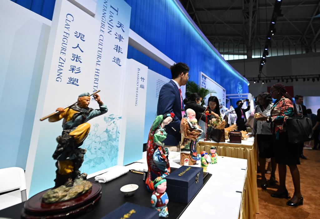 6月27日,与会嘉宾在第十四届夏季达沃斯论坛文化之夜现场了解天津非遗项目。新华社记者 赵子硕 摄