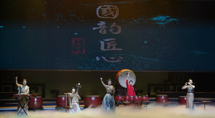 《国韵·匠心》以中国古代哲学五行理论为概念支点,延伸为“金石为开”“良木逢春”“青山绿水”“薪火相传”“幸福乐土”5个篇章,每个篇章都包含全新创作的民乐作品、舞蹈与古诗词名篇,比如,“金石为开”篇章中,民乐与打击乐合作的《天工开物》《锦绣画卷》两首作品优美开阔,中国鼓合奏《金鼓喧阗》激荡振奋;“良木逢春”篇章中,《诗经》中的《采采芣苢》、王维《山居秋暝》被谱曲诵唱,朗朗上口……此外,5个篇章还在开篇部分加入了《匠心·诚所至》《匠心·质求精》《匠心·艺超凡》《匠心·技相承》《匠心·持以恒》的楔子,再现了古筝、榫卯、制笔、灯笼、建筑行业代代相传的工匠精神。