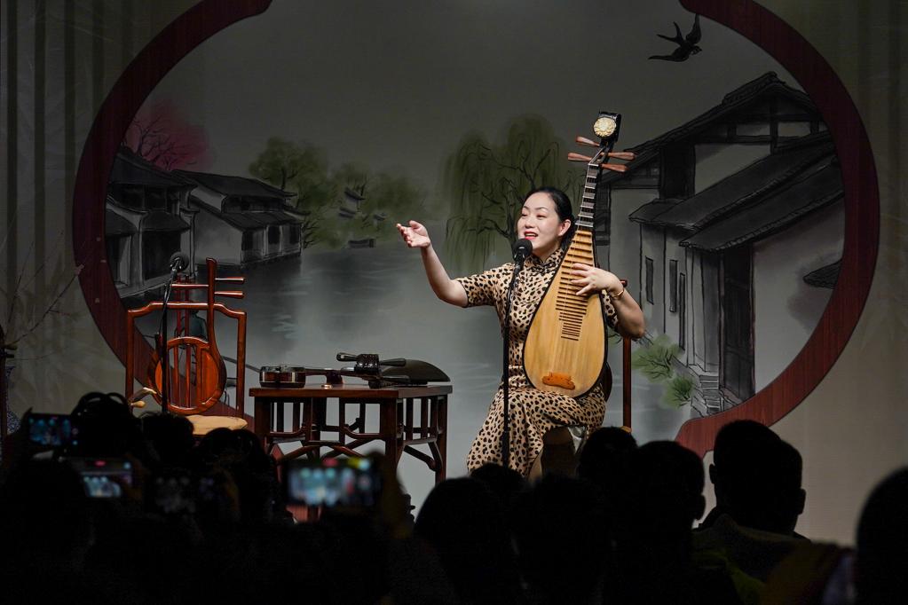 评弹演员在苏州市姑苏区一处评弹茶馆演唱苏州评弹版《声声慢》(2023年4月5日摄)。新华社记者 李博 摄