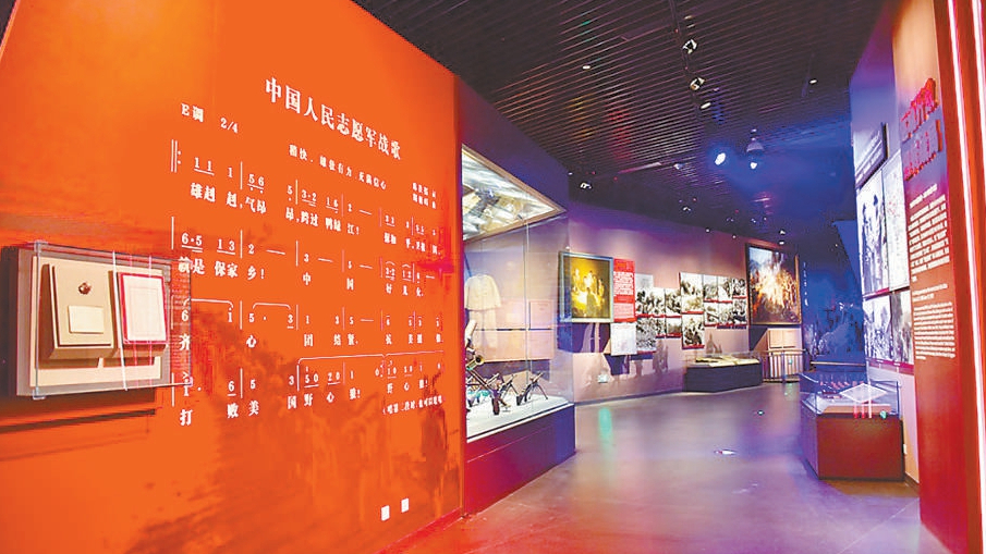 抗美援朝纪念馆中,“战歌”书写在一面展墙上,周巍峙曲谱手稿一同展陈。 供图/抗美援朝纪念馆
