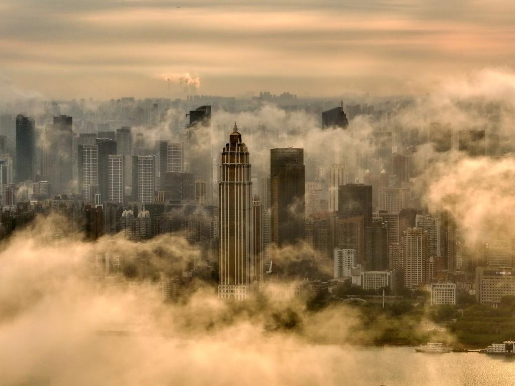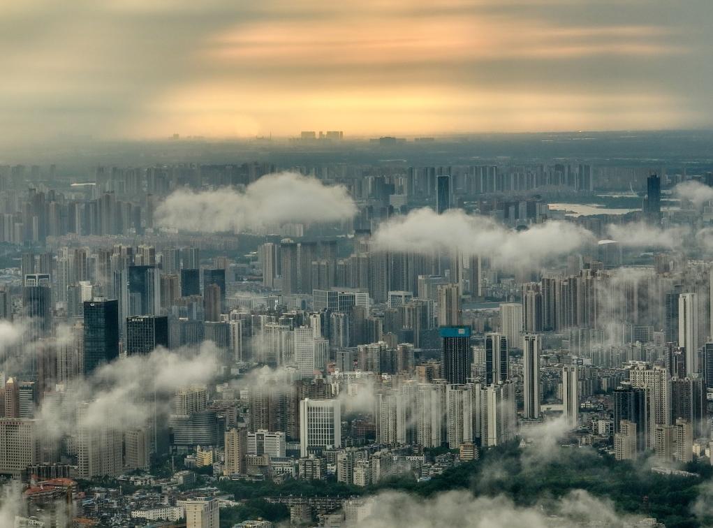 7月19日,湖北省武汉市雨后天晴,城市与云海、彩虹相映成趣,如梦如幻。 新华社发(赵军摄)