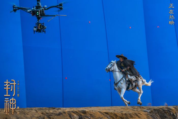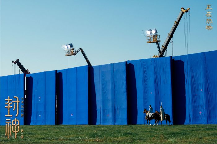 由于电影中有冀州城之战等马术战争戏,运动范围大,对蓝幕的需求量也大,最难解决的是蓝幕长度和高度的问题,最终机械组选用了一个相对灵活的方式:用挖掘机改装移动蓝幕。导演乌尔善在特辑中介绍:“我们做的这个移动蓝幕,把那个挖掘机斗拆掉,用桁架做成蓝幕方框,它可以随时地移动。”每次转场时,规模庞大的移动蓝幕挖掘机队伍也成为《封神三部曲》片场一道独特的风景。