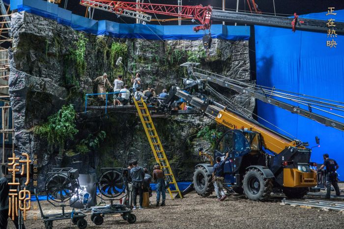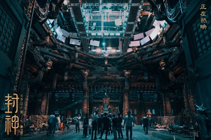 为提高拍摄效率,导演乌尔善透露,剧组做了一些很重要的探索:“首先是在我们拍摄的主要的摄影棚,专门搭了为灯光工作的桁架,就不用在现场来改变灯的位置,这是一个非常高效率的工作方式。”场景美术团队在一万平米的摄影棚里搭建了饕餮追袭姬发的原始森林,而灯光组也要在万米摄影棚上面吊满了灯。摄影指导王昱在特辑里透露:“你看郝峰老师(灯光指导)正在装车,杀青那天他夸张地说我得装两个月,才能把这些灯运回北京。”