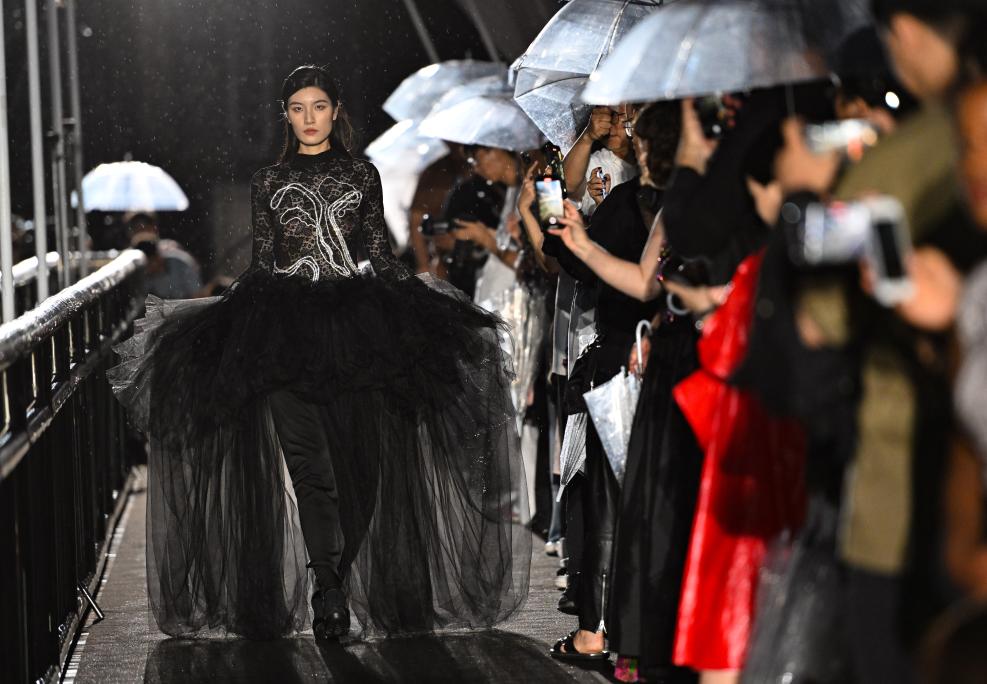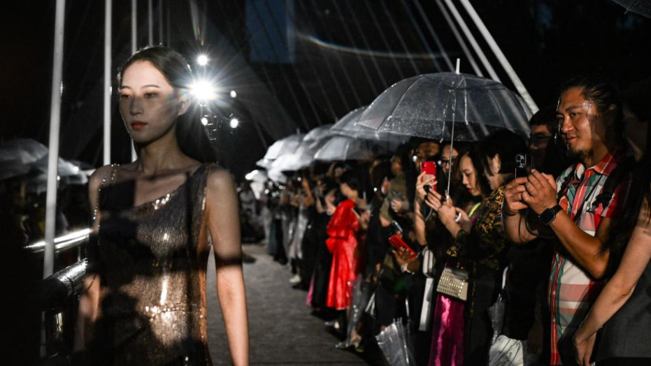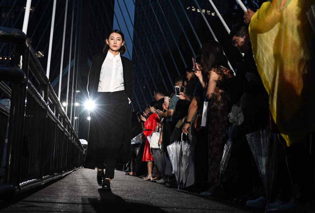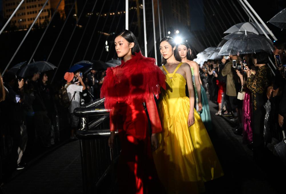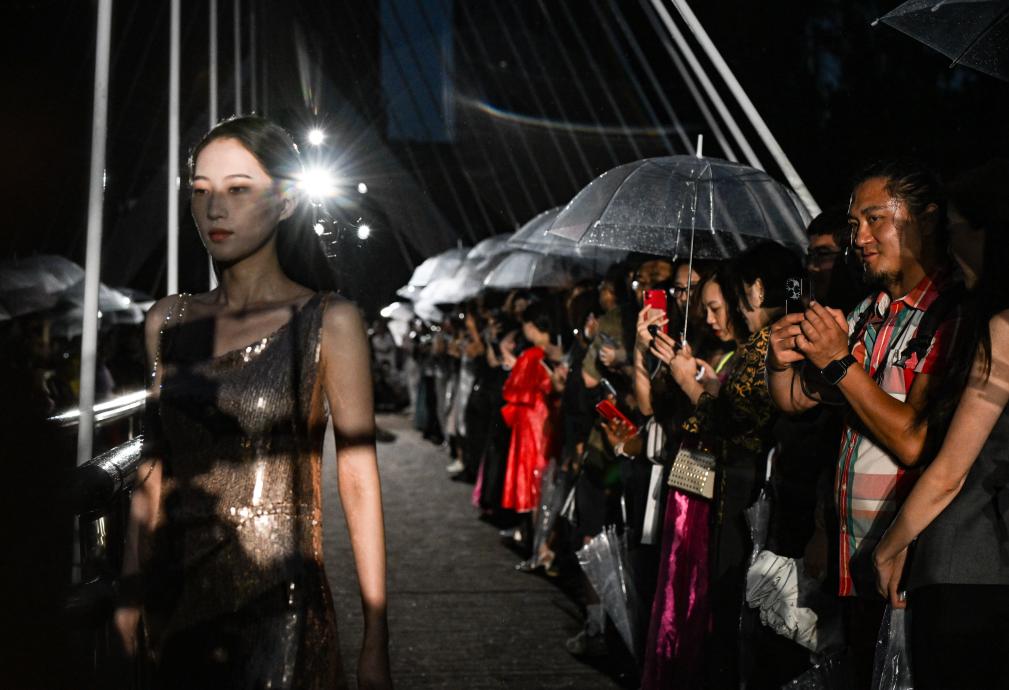 7月27日,观众在亮马河友谊桥上观看时装秀。 当日,在北京亮马河友谊桥上,一场名为“型走亮马河”的国际时装秀在雨夜中上演。