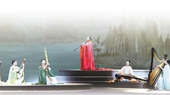 在《墨戏》中,古筝演奏配合中国舞的水袖身姿,刚柔并济,虚实相生,展现书法艺术行云流水的音韵美、律动美和线条美,让人沉浸在水墨世界中。多媒体画面选自《兰亭集序》,琴音流转,笔墨挥洒。