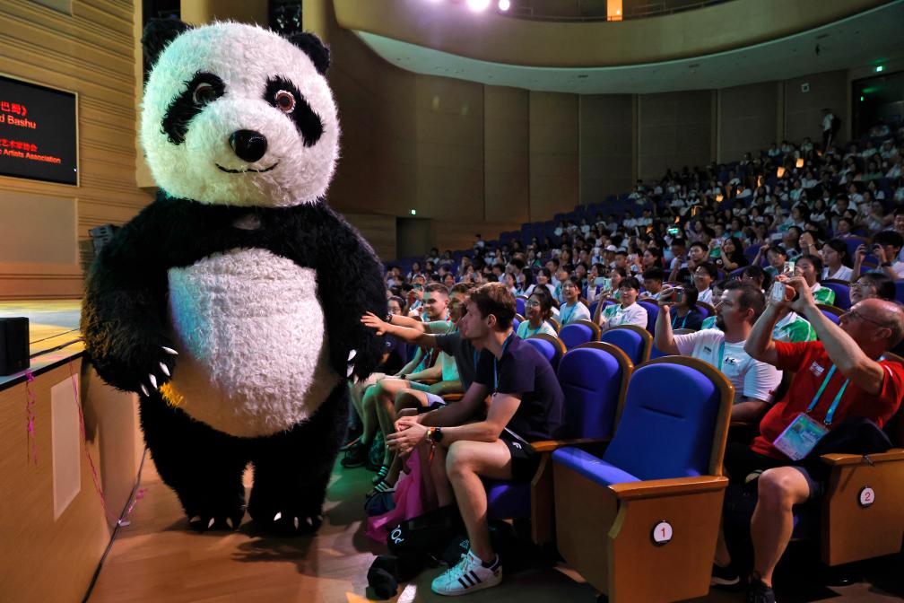 8月2日,一名演员装扮成大熊猫在演出间隙与观众互动。新华社记者 沈伯韩 摄