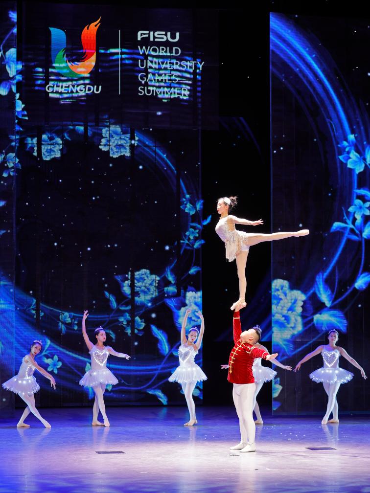 8月2日,来自成都市杂技艺术家协会的演员表演杂技《肩上芭蕾》。新华社记者 沈伯韩 摄
