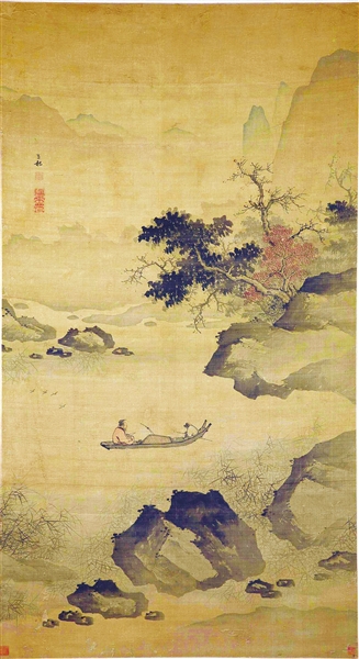 天博馆藏明代蒋嵩的《秋江归棹图》轴,画中远山如黛,江面微微泛波,一叶小舟悠然浮在水面。船夫回头张望,船尾一老者闲适地看书,任凭小舟在水中飘荡。岸上有山石树木,水边有芦苇丛丛,一派秋季的醉人风光。天博书画研究部的李晶介绍:“画面层次感很强,布局优美,远山近水、山石、树木、芦苇搭配得相得益彰。内容丰富,意境简淡,水墨厚重。山石兼皴带染,笔墨滋润。”