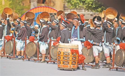 在南丹里湖瑶族乡瑶望天下景区,白裤瑶群众表演了规模宏大的铜鼓舞。(苏柳阳 摄)
