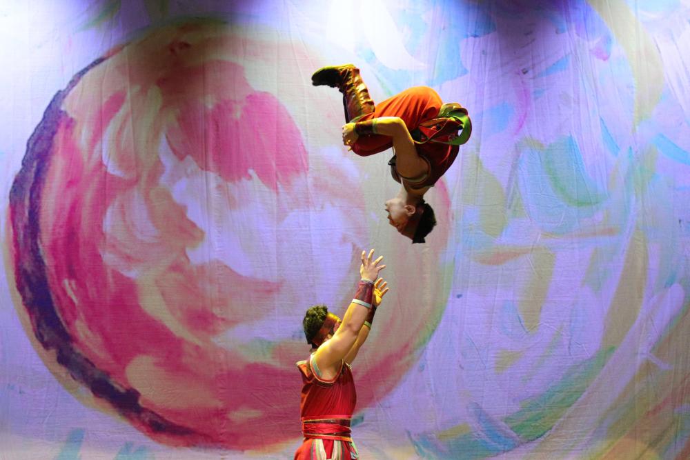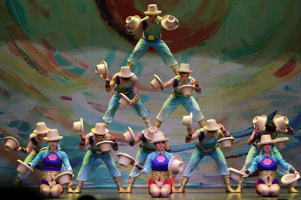 9月3日,湖南省杂技艺术剧院的演员在西班牙马德里EDP格兰维亚剧院演出。新华社记者 孟鼎博 摄