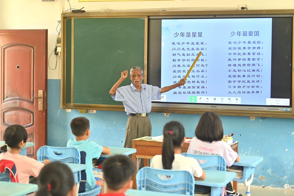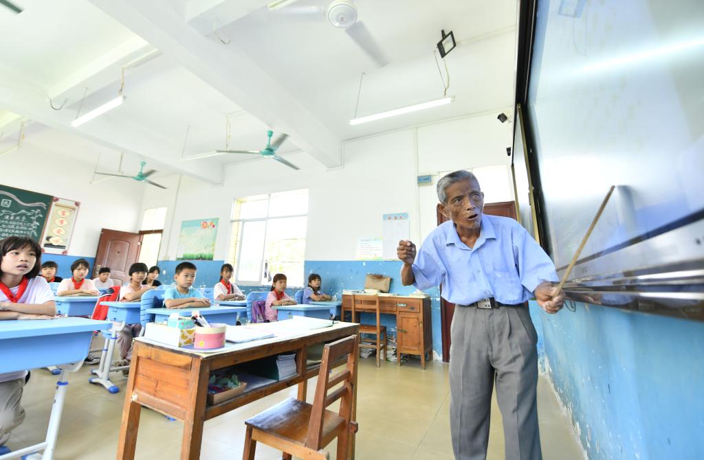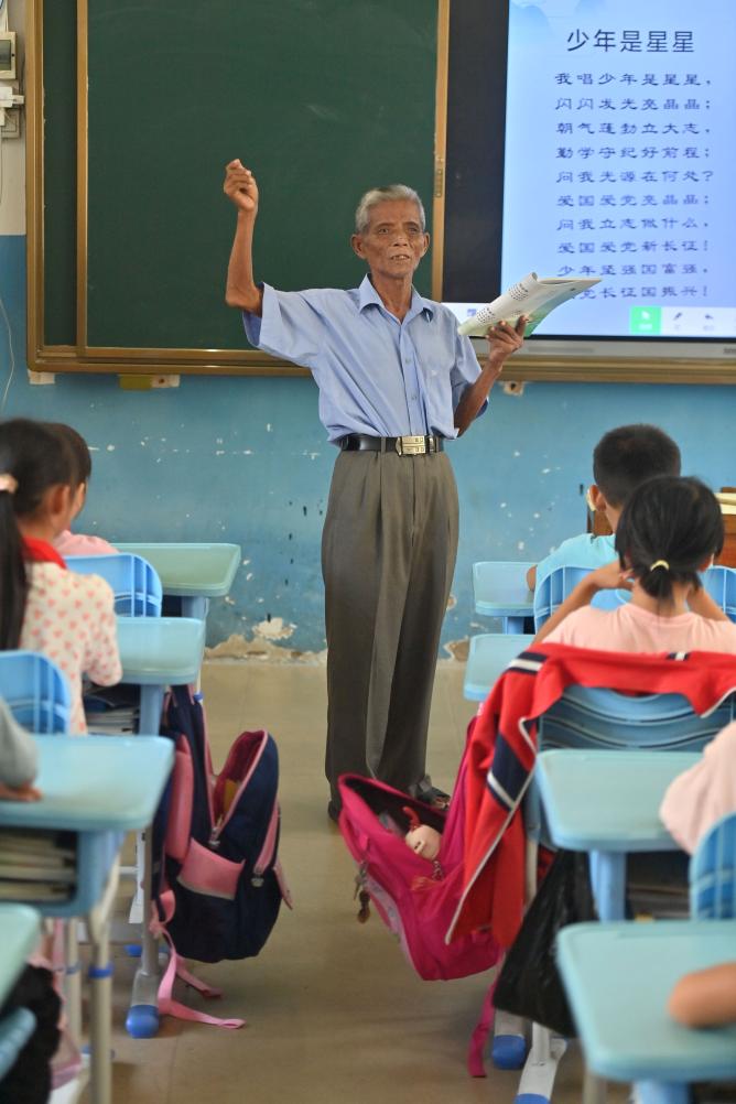 在梧州市长洲区长洲镇泗洲小学,陈明仲在教孩子们唱下俚歌(9月5日摄)。新华社记者 黄孝邦 摄