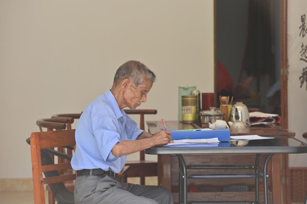 在梧州市长洲区长洲镇泗洲村的家中,陈明仲在整理自己创作的下俚歌词文稿(9月5日摄)。新华社记者 黄孝邦 摄