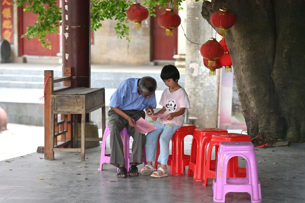 在梧州市长洲区长洲镇泗洲村,陈明仲(左)在教小学生唱下俚歌(8月24日摄)。新华社记者 黄孝邦 摄