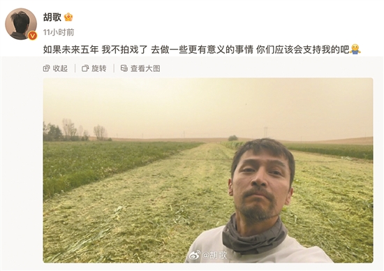 而在今年的8月21日,胡歌曾发微博说:“如果未来五年,我不拍戏了,去做一些更有意义的事情,你们应该会支持我吧?”该条微博引发了“胡歌要退圈”的传闻,让粉丝们既担心又伤心。